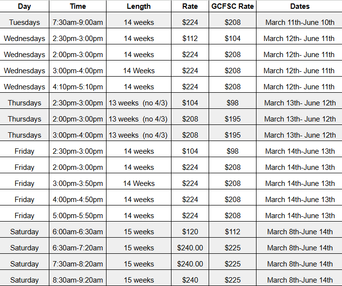 | Saturday | 7:30am-8:20am | Dec 6-March 7 | 14 weeks | $224.00 | $210.00 |