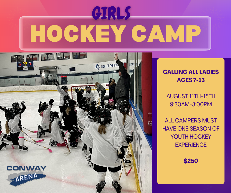 Looking for an affordable hockey camp for you player this summer? Look no further! Conway Arena is offering a 5 day camp with an emphasis on development and fun. On ice sessions will be spearheaded by our beloved Coach Coughlin. Break at lunch time will include movie and street hockey!